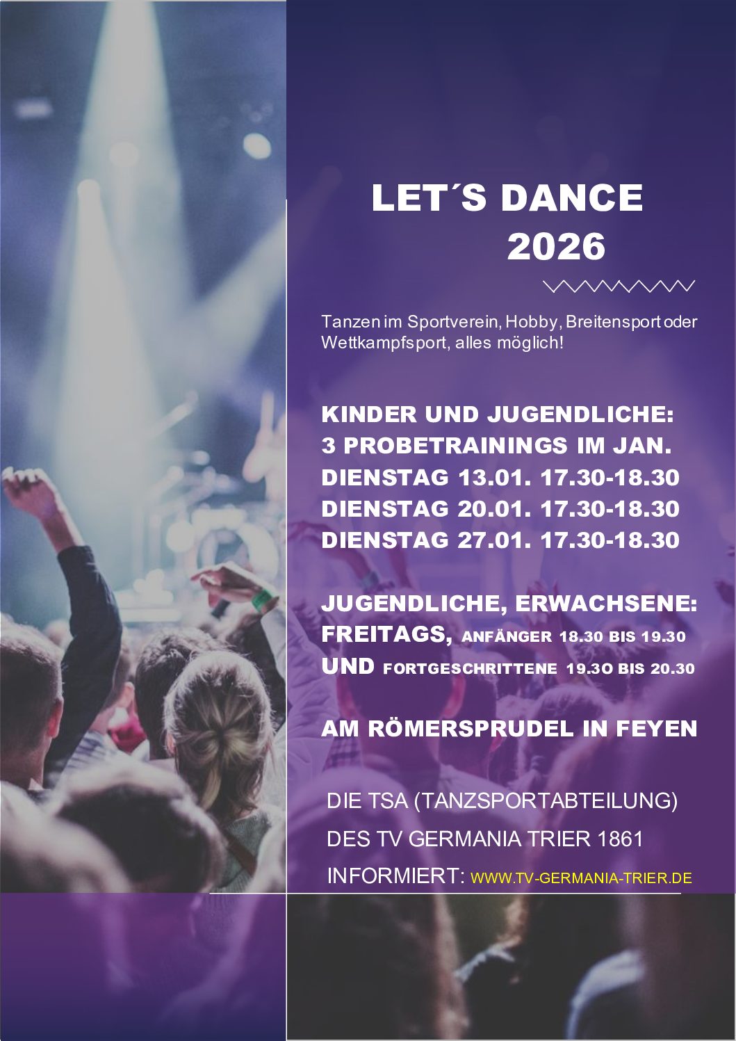 Im Januar bieten wir drei kostenlose Probetrainings an – ideal, um unverbindlich auszuprobieren, ob Tanzen dein neues Hobby wird!